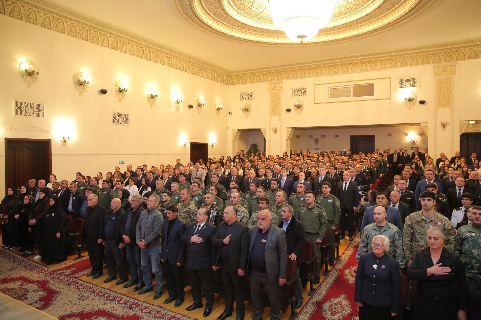 Daha sonra tədbirin rəsmi hissəsinə keçid edilərək Dövlət Himni səsləndirilib və ölkəmizin ərazi bütövlüyü və suverenliyi uğrunda mübarizədə canlarını qurban verən şəhidlərimizin xatirəsi bir dəqiqəlik sükutla yad edilib.