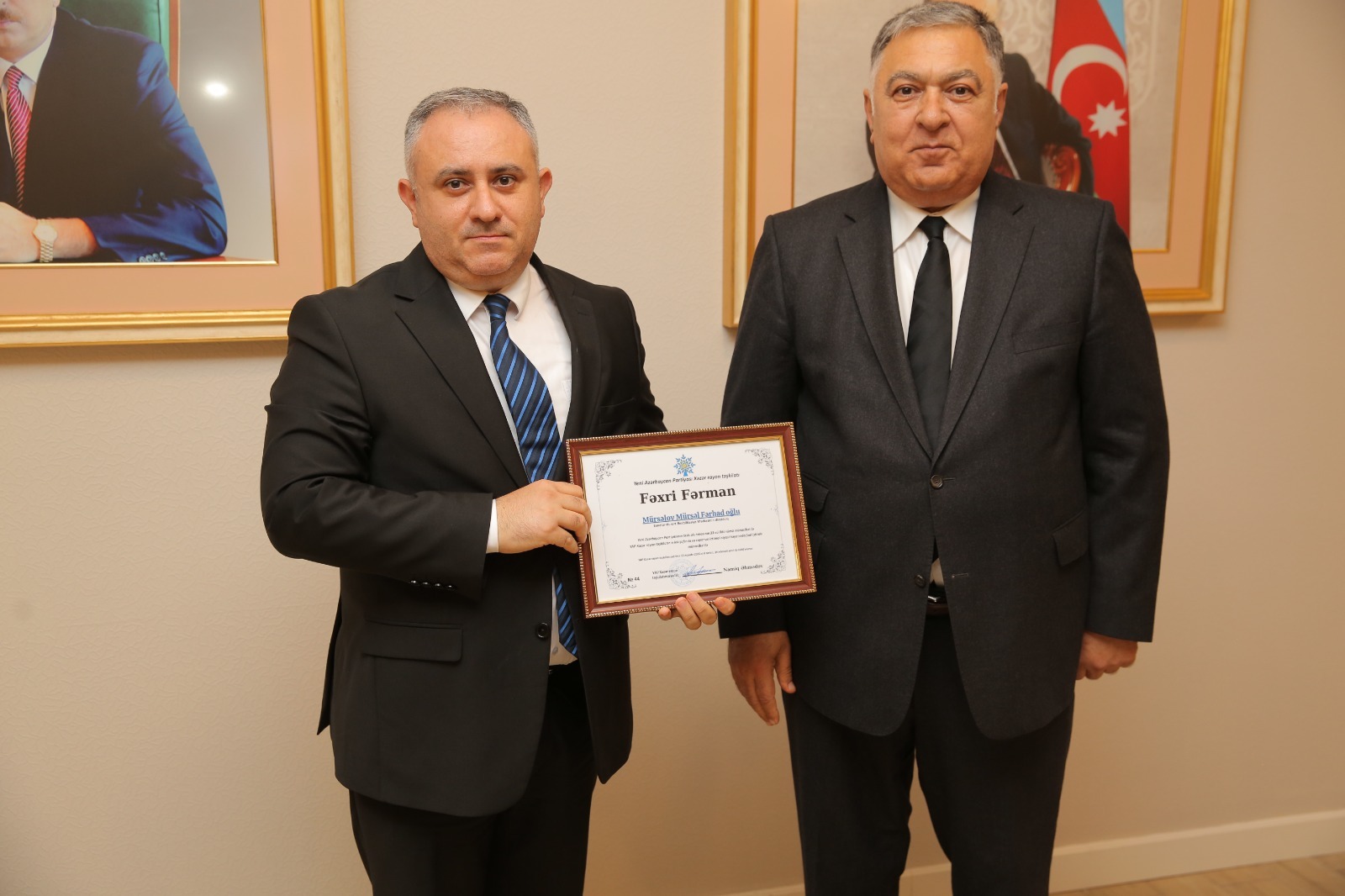 Çıxışlardan sonra Yeni Azərbaycan Partiyasının təsis olunmasının 33-cü ildönümü münasibəti ilə partiya sıralarına yeni qəbul olunan şəxslərə üzvlük vəsiqələrinin təqdim olunmuş, YAP Xəzər rayon təşkilatının inkişafında və rayonun ictimai-siyasi həyatında fəal iştirak edən partiya üzvlərinin fəxri fərman və qiymətli hədiyyələrlə təltif edilmişdir.